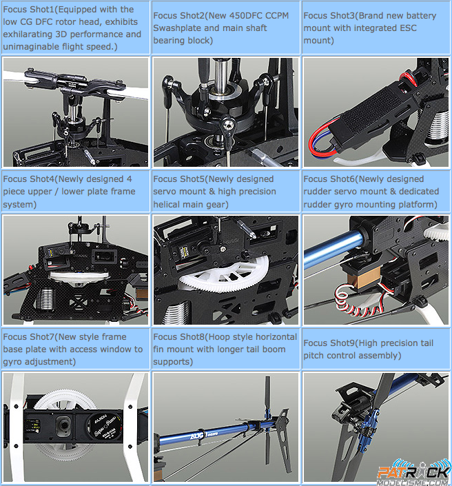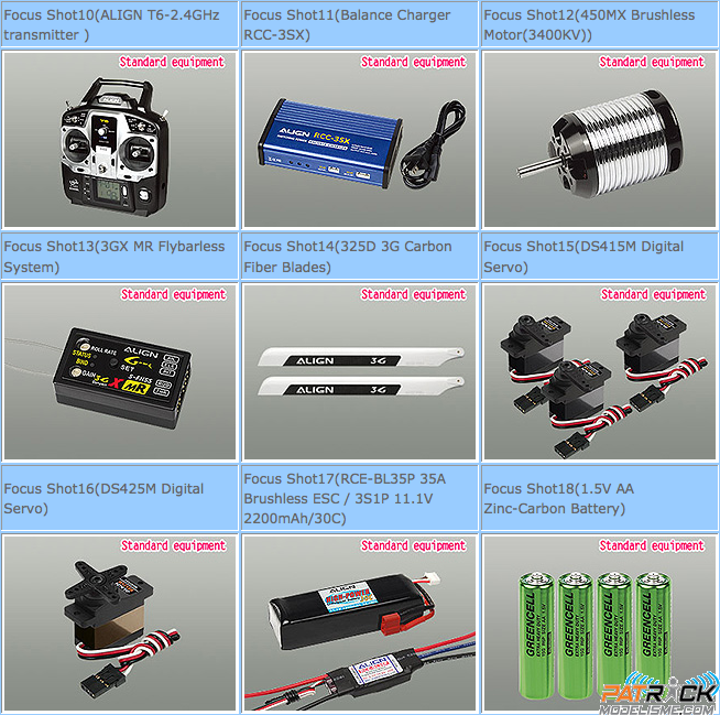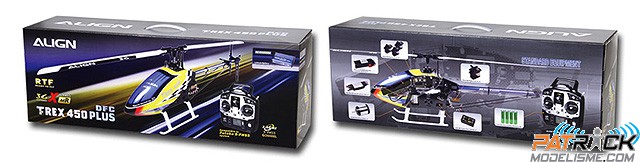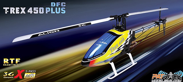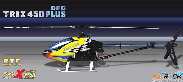 Le nouveau modèle T-REX 450 PLUS DFC Super Combo est un hélicoptère entièrement assemblé et mis au point du type RTF (Ready to Fly), basé sur la version T-REX 450 Sport V2. L'hélicoptère est livré avec un ensemble de radiocommande ALIGN T6 (sur la base d'une Futaba T6J) avec accu et en plus avec un chargeur pour recharger l'accu d'alimentation du moteur et un accu LiPo 3S. Les servos du plateau cyclique sont les nouveaux servos DS 415M et celui du rotor arrière, le nouveau DS 425M en liaison avec le nouveau système sany barre stabilisatrice (Flybarless) 3GX MR, qui comprend également un récepteur 2,4 GHz S-FHSS intégré. Avec ce paquet on dispose de tout ce qui est nécessaire pour démarrer dans le pilotage des hélicoptères modèles réduits.