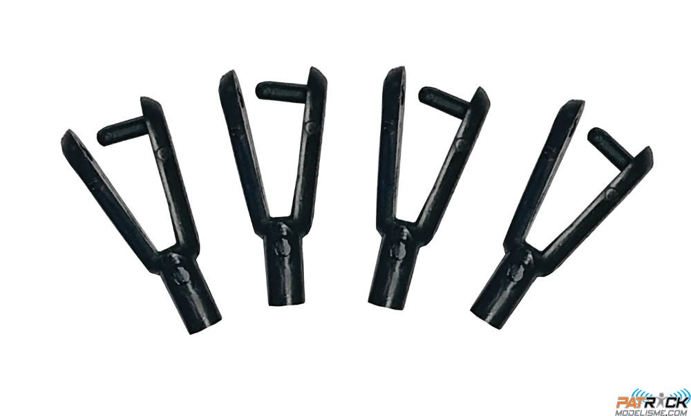 L'installation est simple. Dans certains cas, il peut être nécessaire d'agrandir légèrement les trous du bras de servo ou du palonnier. Un simple perçage avec un foret de 1,6 mm (1/16") ou n° 52 suffit généralement. Une fois installée, la chape s'enclenche fermement et reste verrouillée, même en cas de vibrations ou de contraintes en vol.