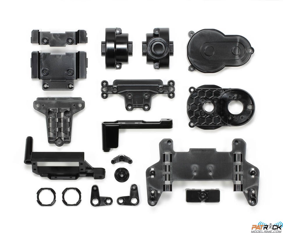 Voici les pièces D (boîte de vitesses) du châssis MB-01. Utilisez-les pour maintenir votre châssis en parfait état. La grappe de pièces D comprend les composants suivants : support moteur, boîte de vitesses, pont supérieur, support pour équipement radiocommandé, pièces de direction, pièces de réglage de l'empattement, et plus encore.