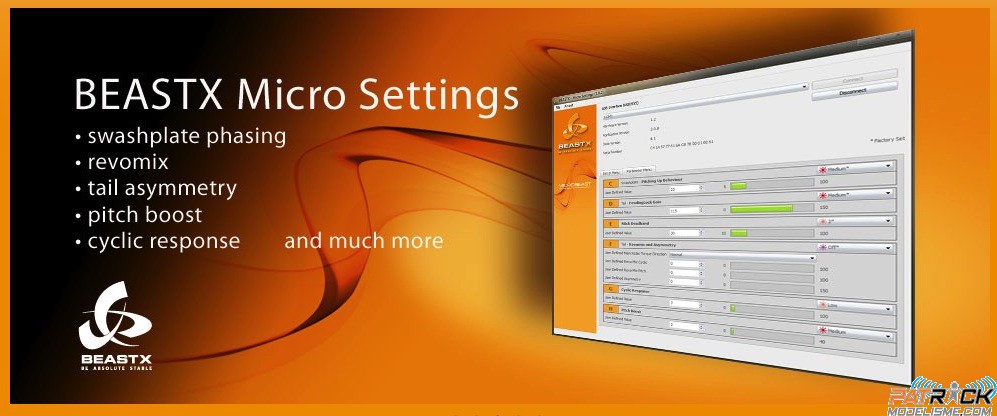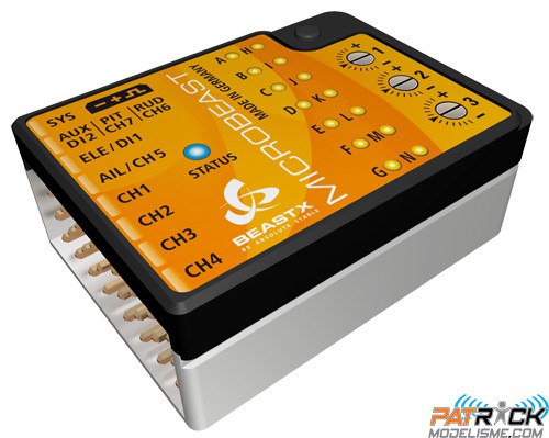En outre le gyro MICROBEAST de plateau cyclique intégrée permet l'utilisation de simples systèmes de contrôle à distance qui ne disposent pas de leur propre plateau cyclique de mélange (NO-MIX).