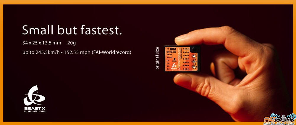 MICRO BEAST est enfermé un boîtier design en aluminium composite. Ses faibles dimensions lui permettent d'être installé dans pratiquement n'importe quel modèle d'hélicoptère. MICROBEAST peut être installé aussi bien horizontalement que verticalement.