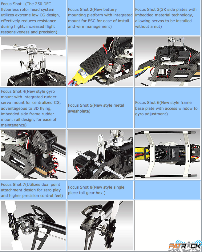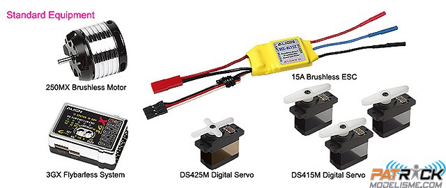 Pour la première fois le modèle T-REX 250 est également disponible en version sans barre stabilisatrice (flybarless) ! De très nombreuses modifications ont été apportées à cet hélicoptère pour en faire le phare des mini-hélicoptères 3D sur le marché. Les améliorations suivantes ont catapulté le modèle T-REX 250 PRO DFC Combo à la pointe de cette catégorie d'hélicoptères. Outre le nouveau servo numérique DS415M (plateau cyclique) et le servo DS425M (rotor arrière), Align a également équipé le petit bonhomme d'une tête de rotor sans stabilisateur (DFC Flybarless). Le variateur sans balais 15A RCE-BL15X connu de la version précédente assure que le moteur sans balais 250 MX délivre toute sa puissance. Mécaniquement il n'y a pas que la tête qui a changé. Le nouveau rotor arrière à double asservissement est équipé pour la première fois d'une transmission rigide.