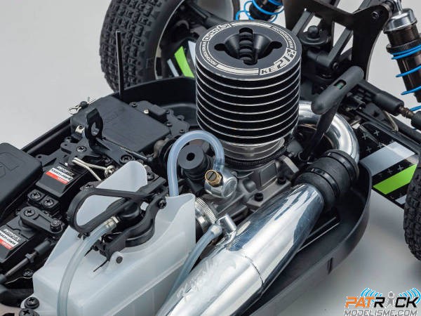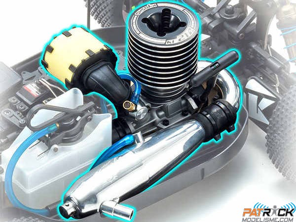 Le moteur à lanceur intégré est le dernier moteur Kyosho KE21SP à sortie d'échappement arrière et à culasse haute.