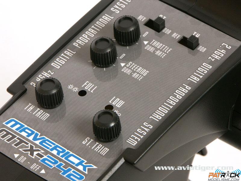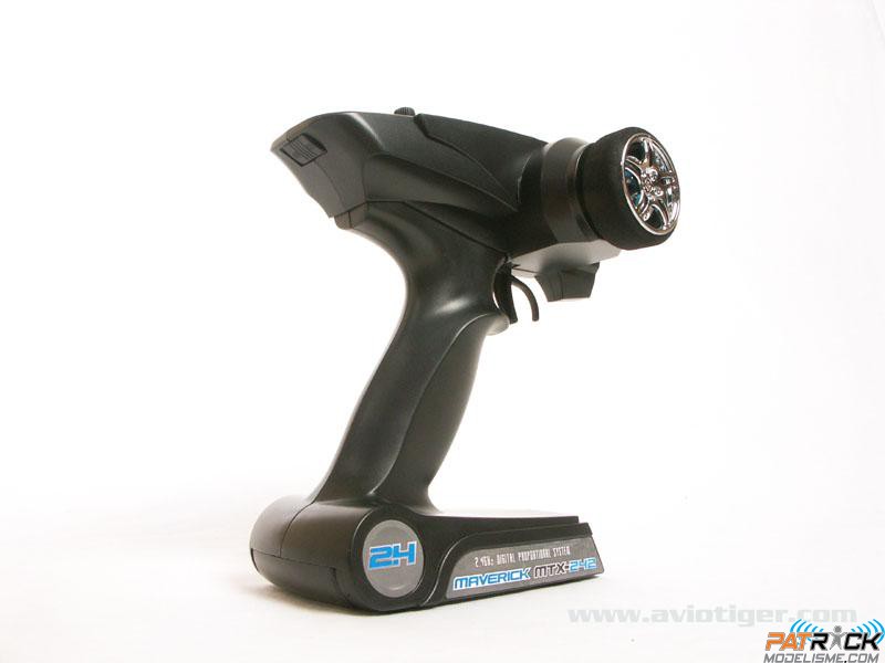 Nous recensons encore une clé spéciale à tube de 23 mm de diamètre qui permettra d'accéder aux écrous de roues. Ainsi qu'un émetteur à volant " MTX-242 " en 2,4 Ghz doté de multiples fonctions comme les fins de course. Des paramètres de réglage qui demeureront accessibles au travers de potentiomètres logés sur le dessus de la façade principale du boîtier.