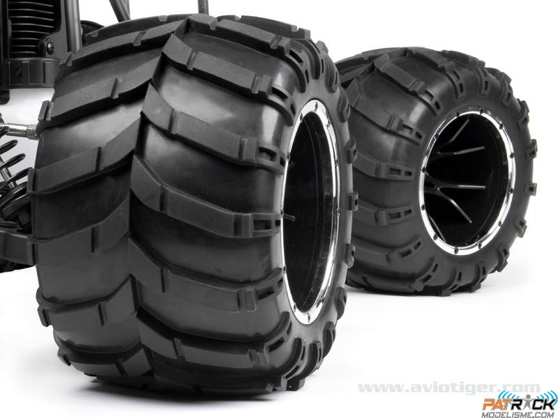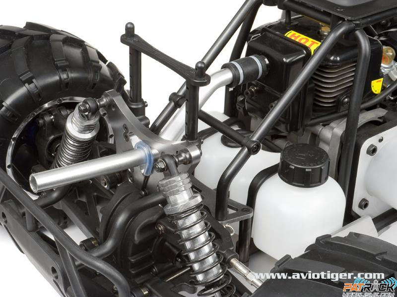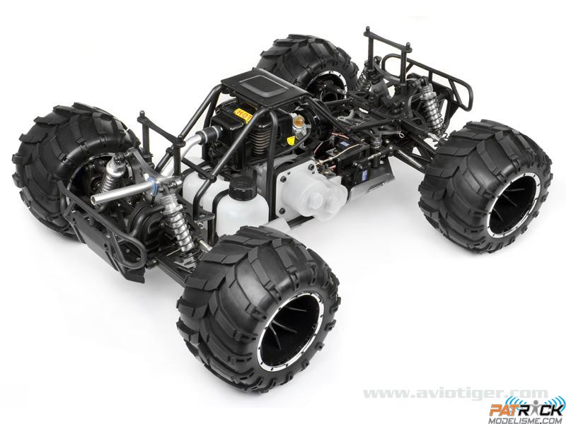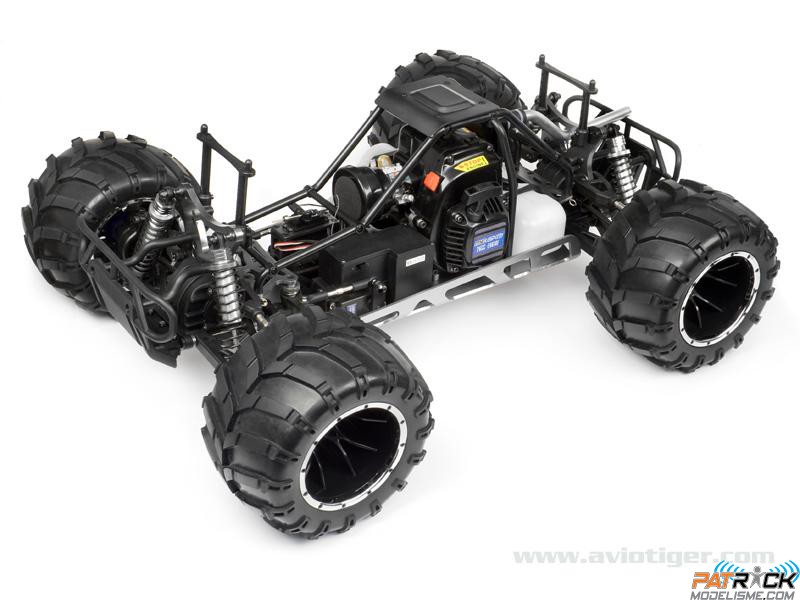 Bonne surprise aussi au chapitre de l’amortissement qui demeure en rapport avec les débattements offerts par les triangulations. Celui-ci donne par le fait accès à tous les obstacles que l’on pourra croiser sur sa route à l’occasion d’une escapade en pleine nature. A ce titre, le monster est en mesure de se déjouer avec une relative facilité de tous les amoncellements de cailloux et de toutes les bosses qu'il pourrait croiser, son châssis encaissant vraiment tout sans broncher. Le moteur possède comme l'en s'en serait douté un couple de camion, et sa vitesse de pointe, certes perfectible, ne semble pas trop pâtir de l’absence d’un vrai résonateur. De son côté, le freinage confié au double disque en époxy s’est montré endurant au cours du test. Cela dit, il réclamera de votre part de bien savoir ajuster la bague d'arrêt qui actionne la came des plaquettes en laissant un peu de distance avec celle ci, car les roues auraient tendance à se bloquer à la moindre pression sur la gâchette de l'émetteur. Conséquence de quoi : si l’auto est à ce moment là lancée à vive allure, autant dire que c’est le tout droit assuré !