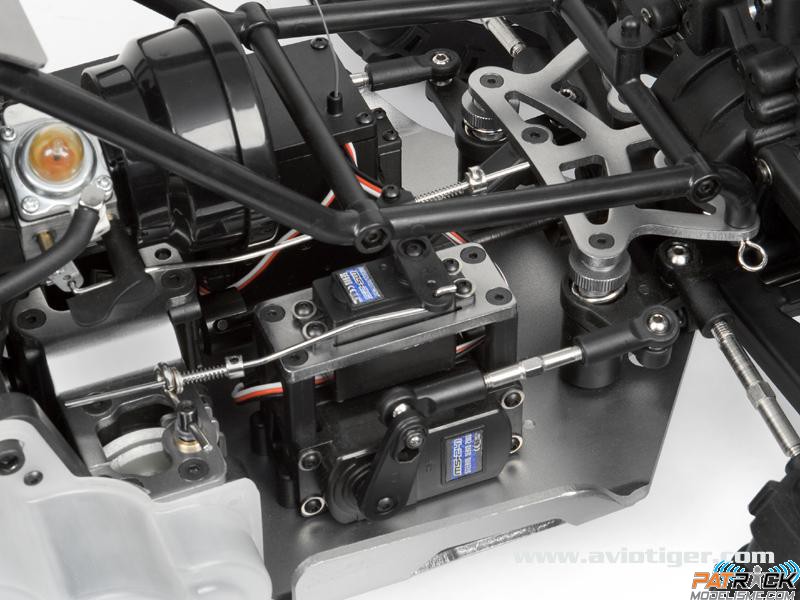 En dehors de l'émetteur que nous avons déjà décrit un peu plus haut, le Blackout MT adopte un équipement radio tout à fait intéressant dans la mesure où celui-ci fait appel à deux servos pour diriger les roues avant. Qui plus est, deux servos à pignons métalliques dont le couple s'établit à 20 kilos par unité. Soit près de 40 kilos pour déplacer l'auto dans les virages. Des chiffres pour le moins ahurissants !