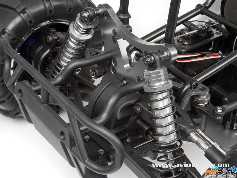 La longueur des bras a bien entendu été conçue pour faire travailler au mieux les suspensions. Celles-ci seront assistées dans leur tâche par des amortisseurs métalliques à corps filetés pourvus de ressorts réglables en tension via des molettes. Des amortisseurs qui restent équipés de soufflets de protection et qui disposent de tiges de cinq millimètres de diamètre.