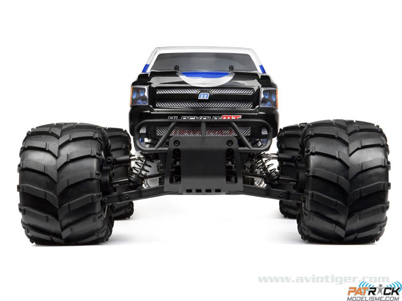 Le gros monster dispose sinon d'une carrosserie quadricolore en lexan, décorée avec sobriété. Le carton d’emballage contient encore un pack d'accus câblés de réception de 6 volts qui devrait procurer une autonomie au moins égale à celle du réservoir de 700 cc mis en place de série, puisque celui-ci fait 2500 mA. Un mini chargeur qui fonctionne sur du 220 volts vient se joindre à cette batterie.