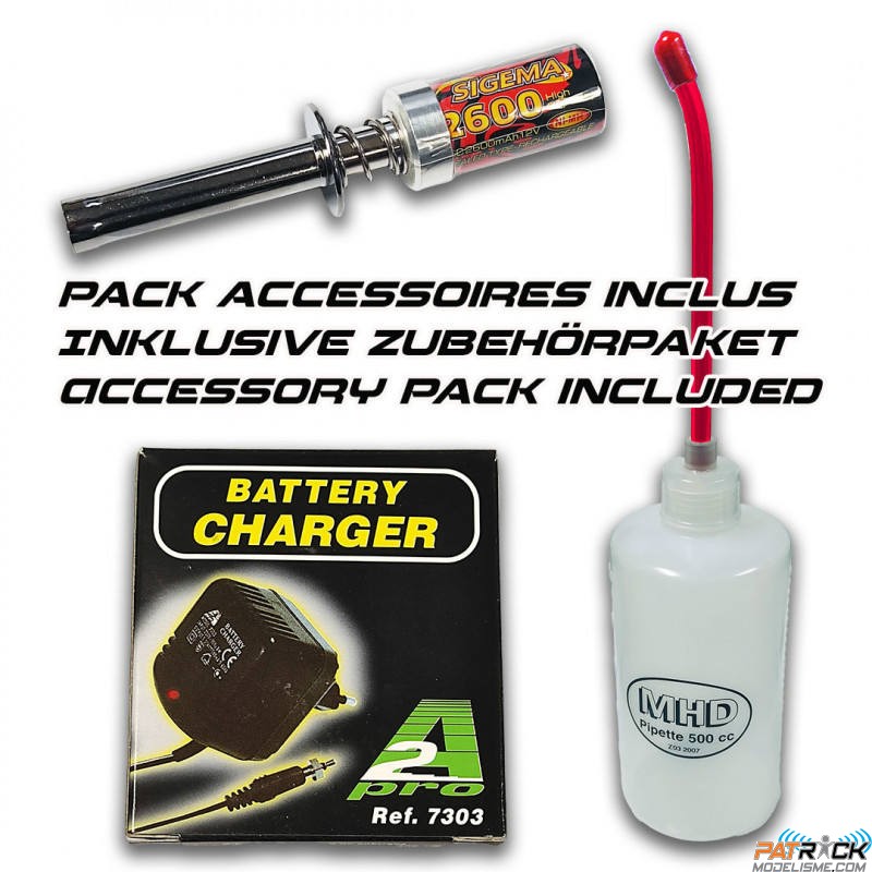 Ils sont livrés avec une pipette pour remplir le réservoir de carburant, un socquet d'alimentation de la bougie pour le démarrage du moteur et son chargeur de secteur.