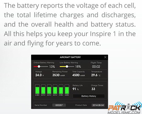 The battery tracks the voltage of each cell, the total lifetime charges and discharges, and the overall health and battery status. All this helps you keep your Inspire 1 in the air and flying for years to come.