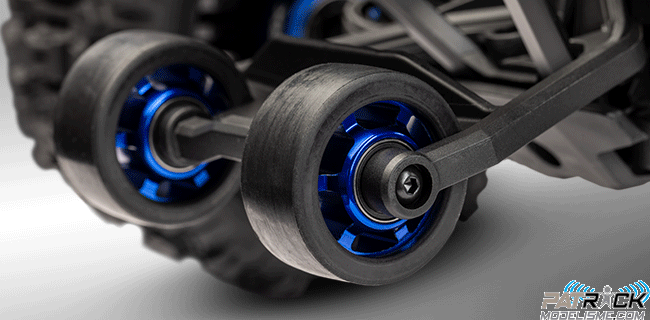 Les immenses pneus Sledgehammer de 5,6” présentent un profil à gros blocs ouverts qui évacue boue et débris pour une adhérence inégalée. Les nouvelles jantes noires chromées donnent au Maxx un look intimidant à la hauteur de ses performances exceptionnelles. Les roues de 2,8” utilisent une monture hexagonale cannelée de 17 mm pour une connexion plus solide avec les essieux en aluminium.