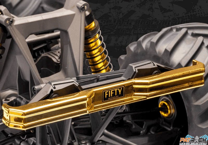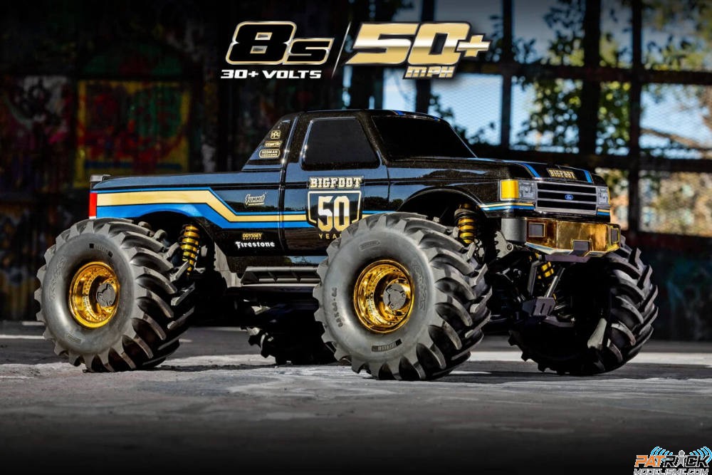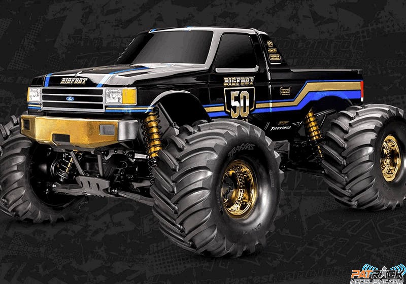 Le X-Monster BIGFOOT Édition Commémorative 50e Anniversaire rend hommage à l’histoire emblématique du Monster Truck original de Bob Chandler avec une carrosserie clipless unique noire et or et des accessoires anodisés or.